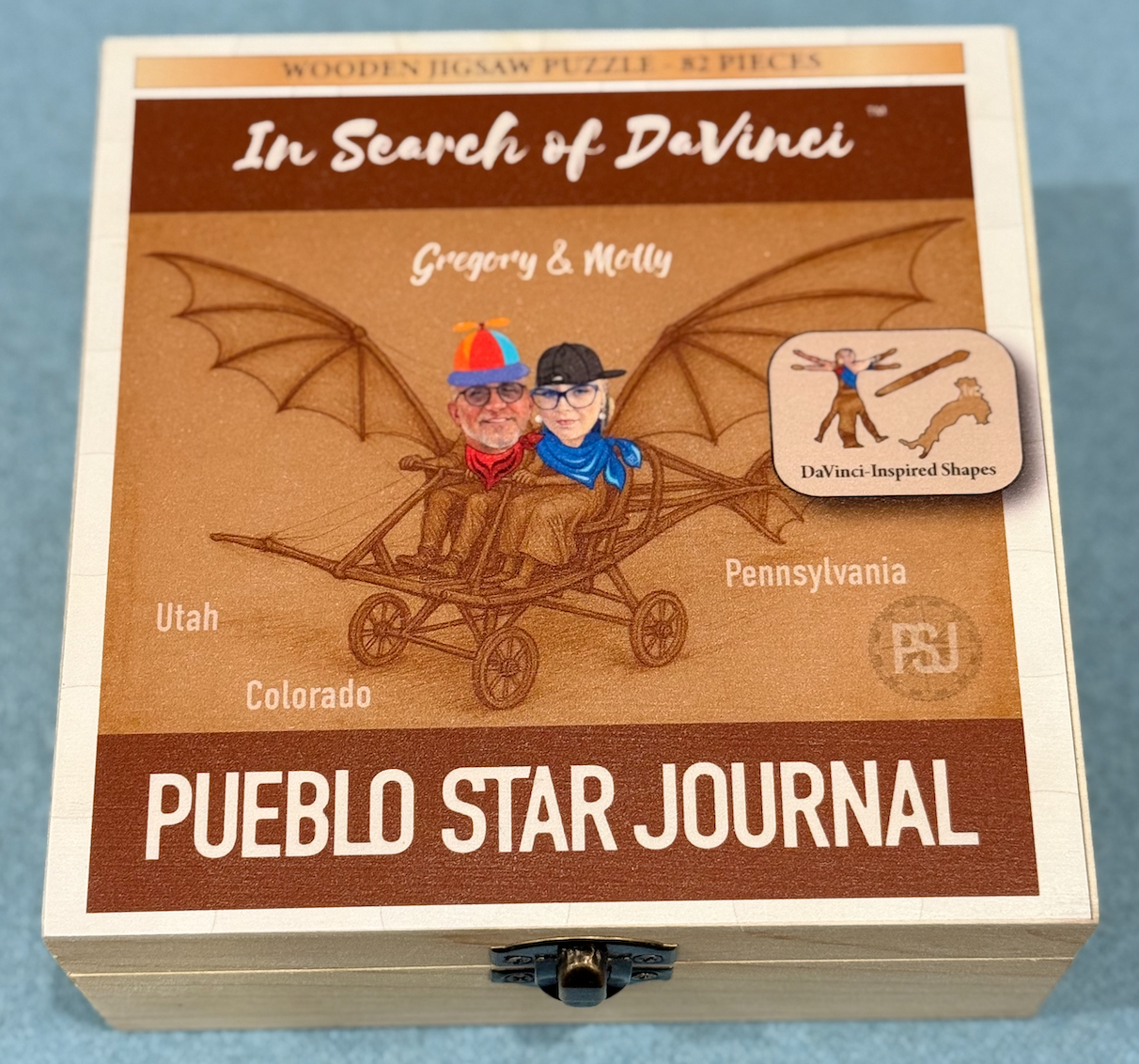 Limited edition special release commemorating the roadtrip docuseries "In Search of Davinci" featuring Gregory and Molly. This wooden puzzle is 7 inches square when fully assembled and consists of 82 wooden pieces including 5 specialty shapes relating to DaVinci's life. Did you know the North America Museum of Leonardo DaVinci is located in Pueblo, CO?