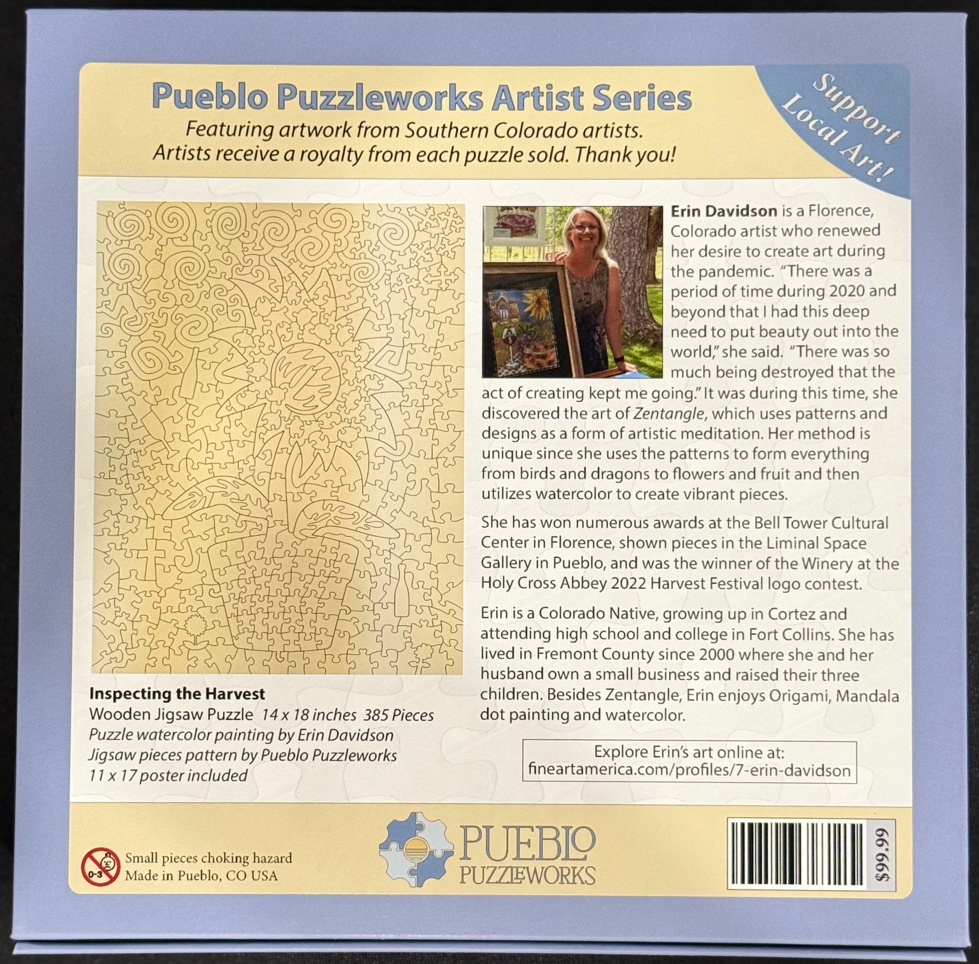 The puzzle is part of The Pueblo Puzzleworks "Artist Series" of wooden jigsaw puzzles, showcasing the work of local artists. "Inspecting the Harvest" by Erin Davidson (Florence, CO) demonstrates the art of Zentangle