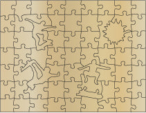 Postcard-sized wooden jigsaw puzzle. Finished puzzle is 5 x 6.5 inches. Contains 65 pieces including theme-inspired "whimsy" shaped pieces.