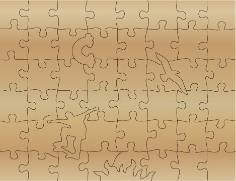 Postcard-sized wooden jigsaw puzzle. Finished puzzle is 5 x 6.5 inches. Contains 52 pieces including theme-inspired "whimsy" shaped pieces.
